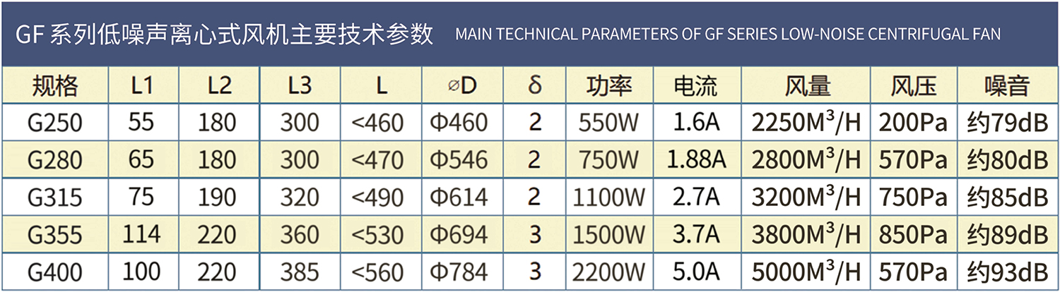 GF系列低噪声离心式风机GL280~630,我公司专为矿井,试验室,和对噪声有特定要求的客户定制研发的风机,此风机具有风量大,风压大,噪声小的特点,最高噪声只有86分贝,比同尺寸的轴流式风机分贝数要小10~20分贝左右!